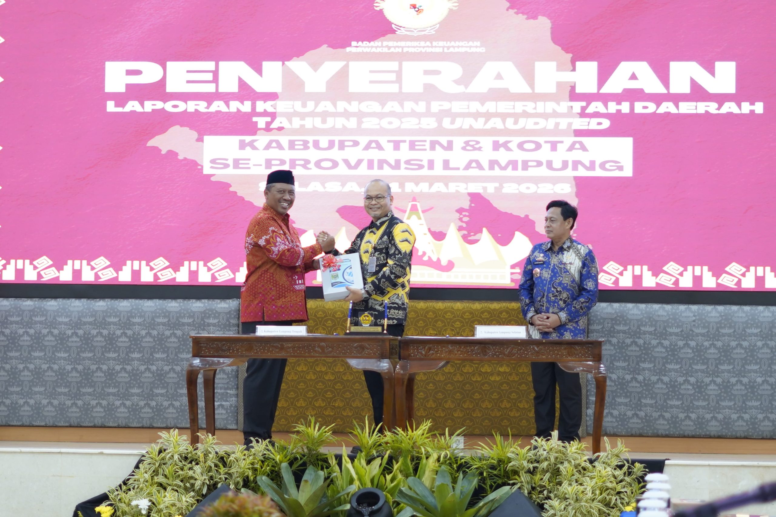 Lampung Tengah||tigonews.net – Pelaksana Tugas (Plt.) Bupati Lampung Tengah, I Komang Koheri, bersama 13 kepala daerah kabupaten/kota se-Provinsi Lampung secara resmi menyerahkan Laporan Keuangan Pemerintah Daerah (LKPD) Unaudited Tahun Anggaran 2025 kepada Kepala Badan Pemeriksa Keuangan (BPK) Perwakilan Lampung. Kegiatan tersebut berlangsung di Kantor BPK Perwakilan Lampung, Kota Bandar Lampung, Selasa (31/3/2026).